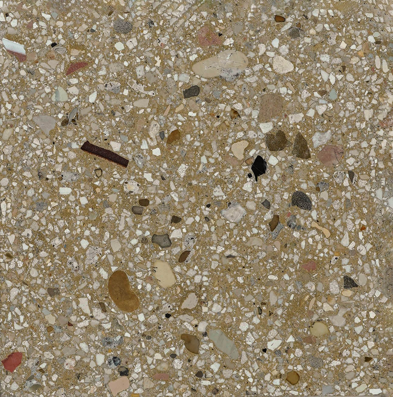 EGGN Terrazzo er sementbaserte, formstøpte flisleggingsplater som er produsert med resirkulerte innslag (ca. 50 %) av marmor, murstein, keramikk eller betong i forskjellige fraksjoner. Hoveddelen av disse innslag resirkuleres etter forbrukerstadiet. Produktets utseende vil derfor i noen grad avhenge av tilgjengelig resirkulert materiale på produksjonstidspunktet. Kalibrerte/jevn tykkelse, avrettet og med fasede kanter. Finnes som gulvplater og sokler. Oppslipbar. Vekt, kg/m²: 20 mm ca 50 kg. Overflate: Polert, slipt. Montering: Flislegging/liming eller legging i mørtel (t≧20 mm). |