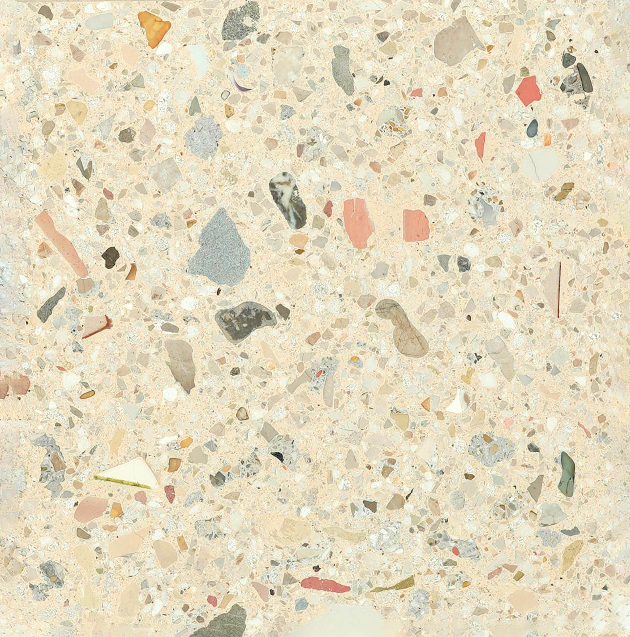 EGGN Terrazzo är cementbundna, formgjutna fogplattor, med återvunnen ballast (ca 50%) av marmor, tegel, keramik eller betong i olika fraktioner. Övervägande del av denna ballast är återvunnen efter konsumentledet. Produktens utseende kommer därmed till viss del att bero på tillgängligt återvunnet material vid tidpunkten för tillverkningen. Kalibrerade/jämntjocka, rektifierade och med fasade kanter. Finns som golvplattor och socklar. Omslipningsbar. Vikt, kg/m²: 20 mm ca 50 kg. Yta: Polerad, slipad. Montering: Tunnsättning/limning eller bruksläggning (t≧20 mm). |